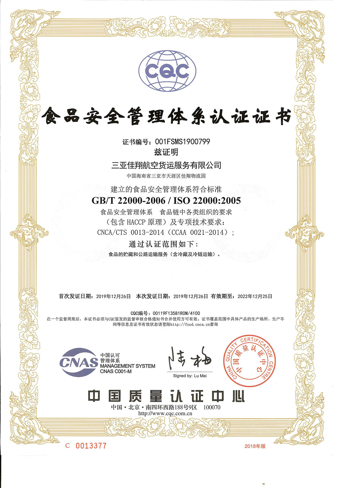 食品安全管理體系認證證書